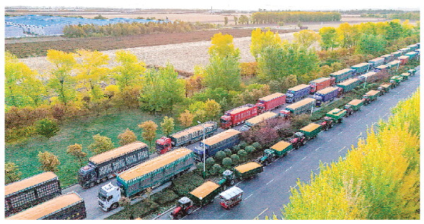 10月15日,卖粮车在黑龙江省佳木斯市富锦市一粮食收储企业门前排队(无人机照片)。