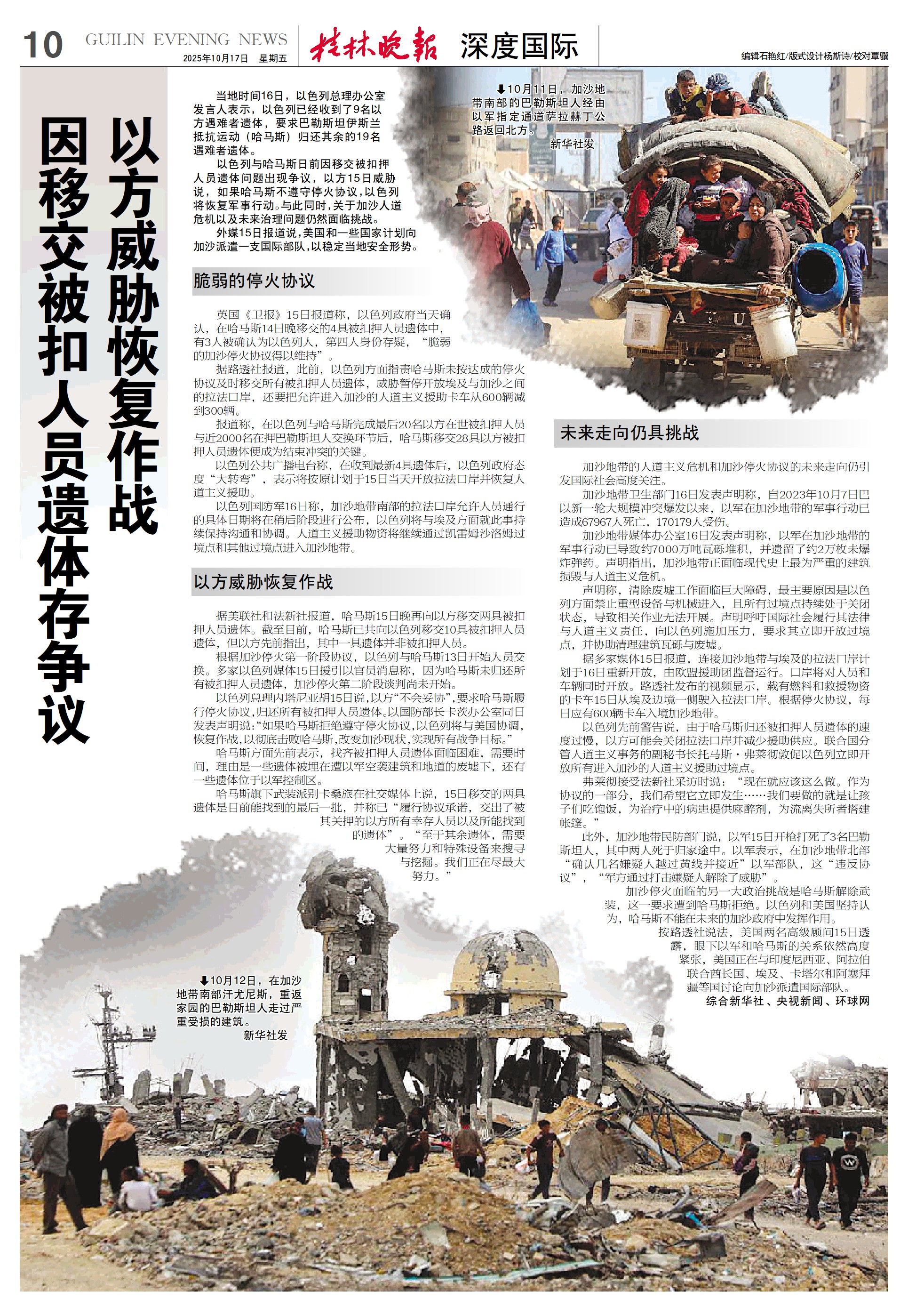 以色列与哈马斯日前因移交被扣押人员遗体问题出现争议,以方15日威胁说,如果哈马斯不遵守停火协议,以色列将恢复军事行动。与此同时,关于加沙人道危机以及未来治理问题仍然面临挑战。