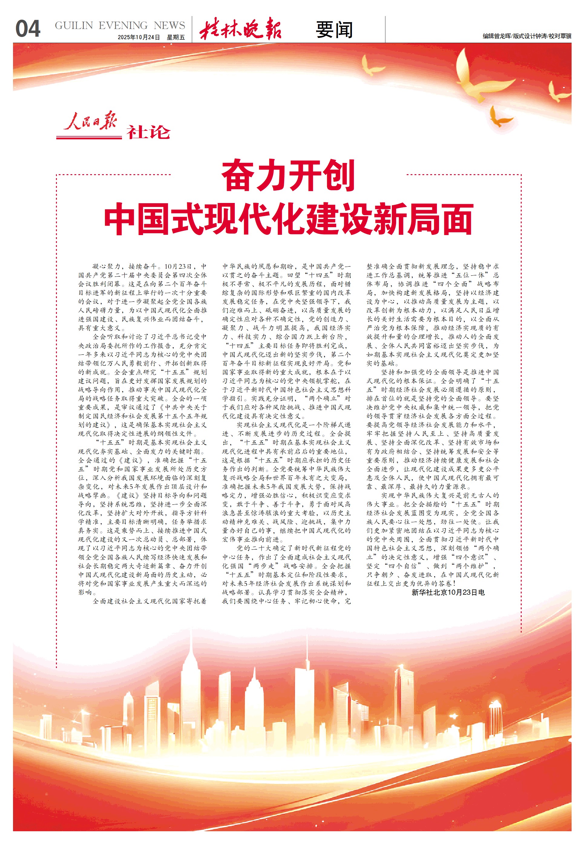 凝心聚力,接续奋斗。10月23日,中国共产党第二十届中央委员会第四次全体会议胜利闭幕。这是在向第二个百年奋斗目标进军的新征程上举行的一次十分重要的会议,对于进一步凝聚起全党全国各族人民磅礴力量,为以中国式现代化全面推进强国建设、民族复兴伟业而团结奋斗,具有重大意义。