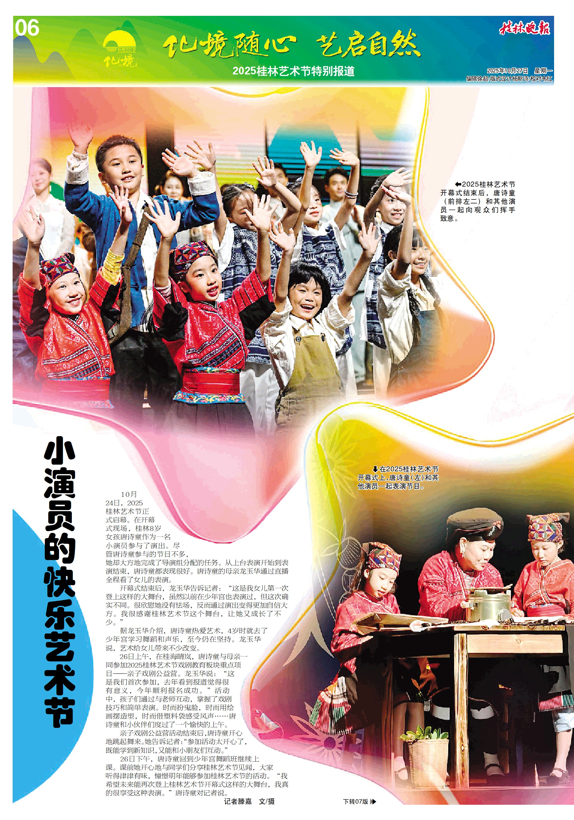10月24日,2025桂林艺术节正式启幕。在开幕式现场,桂林8岁女孩唐诗童作为一名小演员参与了演出。尽管唐诗童参与的节目不多,她却大方地完成了导演组分配的任务。从上台表演开始到表演结束,唐诗童都表现很好。唐诗童的母亲龙玉华通过直播全程看了女儿的表演。
