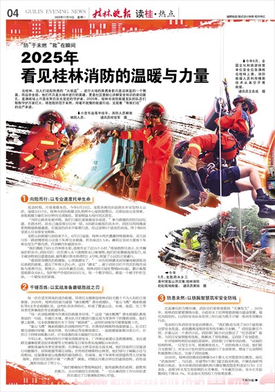 在桂林,当人们说起熟悉的“火焰蓝”,逆行火场的英勇身影只是这抹蓝的一个侧面,而远非全部。他们不只是火场中逆行的英雄,更是社区里耐心讲解安全知识的亲切面孔,是演练场上汗湿衣背仍目光坚定的守护者。2025年,桂林市消防救援支队的队员们默默守护万家灯火,将危险防范于未然,用毫不犹豫的救援行动,兑现着“有我们在”的庄严承诺。