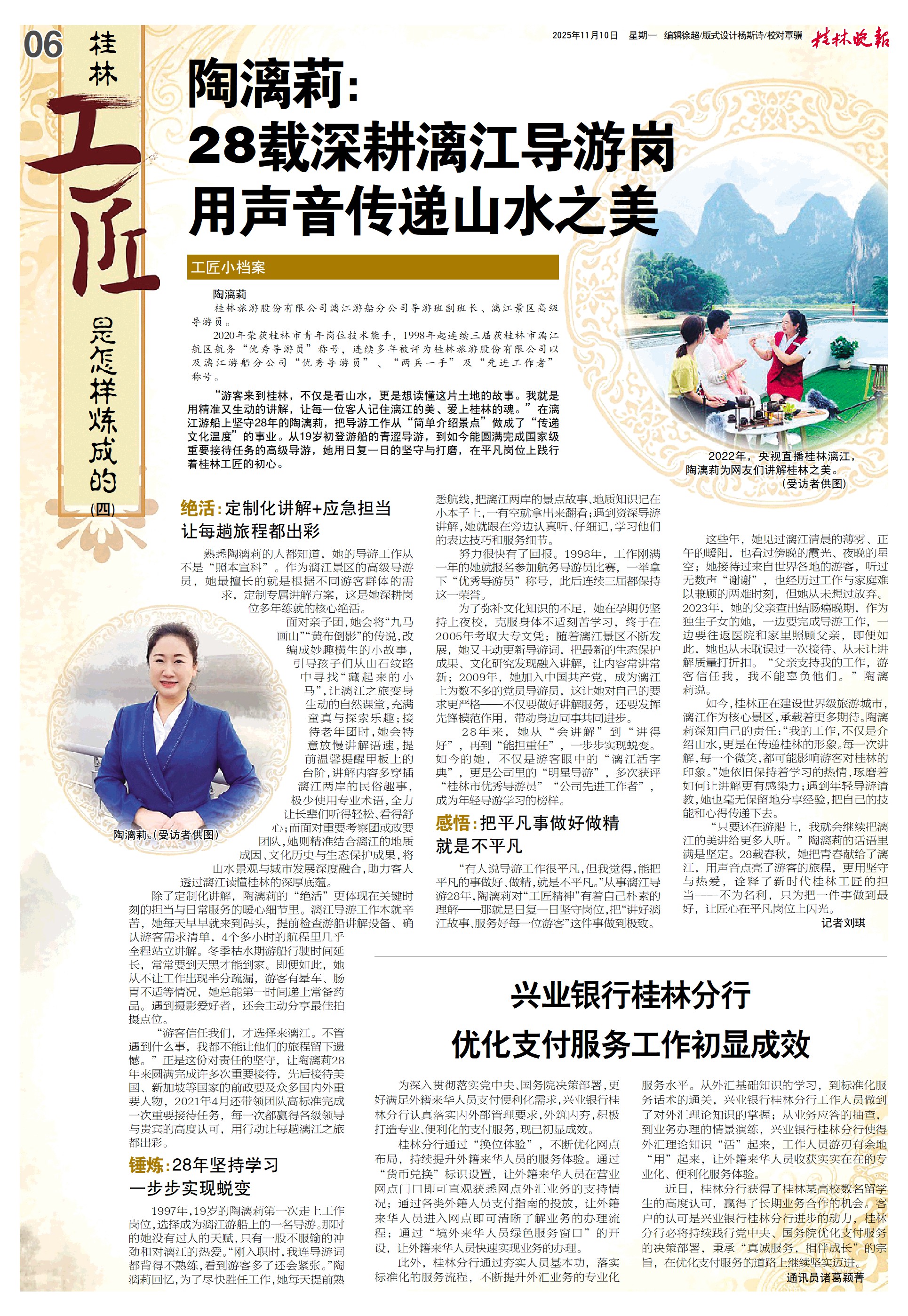 “只要还在游船上,我就会继续把漓江的美讲给更多人听。”陶漓莉的话语里满是坚定。28载春秋,她把青春献给了漓江,用声音点亮了游客的旅程,更用坚守与热爱,诠释了新时代桂林工匠的担当——不为名利,只为把一件事做到最好,让匠心在平凡岗位上闪光。