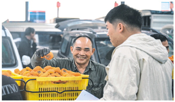 时值柿饼上市,沙子镇作为平乐县最大的柿饼交易市场,果农们每天早上把柿饼拉到这里等待收购商家前来洽谈。8日上午,在达成交易后,果农与收购商开心聊天。