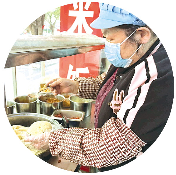 记者点了一份3元的糯米饭。彭巧新戴好头套、口罩和手套后,麻利地舀起一勺糯米铺底,再根据口味依次加入配菜,双手快速一拢,一个圆滚滚的糯米饭便递到了记者手中。咬上一大口,糯米软糯弹牙,带着本身的清甜米香;酸豆角和萝卜干解腻又开胃;香肠的油润、脆饼的酥脆与豆蓉的清甜相互中和,口感层次丰富。糯米在充分吸收馅料香气的同时,又牢牢守住了自身的糯香本味,越嚼越香,回味微甜。