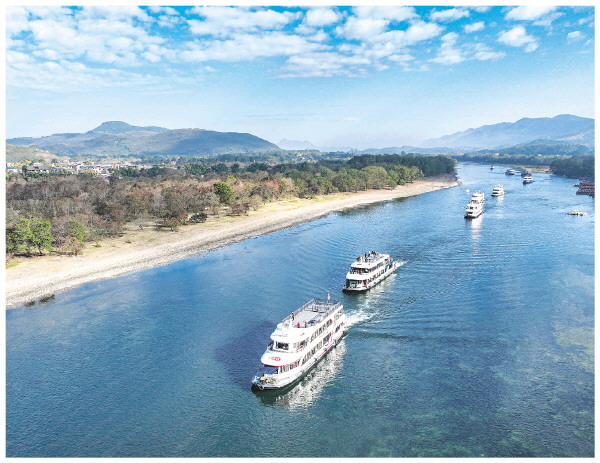 近期,乌桕滩迎来了最佳观赏期,滩涂上的树林红黄绿交织,在蓝天的映衬下美不胜收。附近的江面上,漓江游船成为了这幅山水画卷中的一景,游人们得以从船上这个独特视角欣赏岸边的“季节限定”美景。