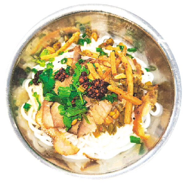 记者点了一碗卤菜粉品尝,裹上卤水的米粉,浓郁却不觉厚重;牛肉入味,金黄的锅烧外皮酥脆,咬下去还会迸出油脂的香气;配上脆酸笋、酸豆角和炸黄豆,再舀一勺店家自制的油辣椒,酸辣鲜香在口中交织。嗦完粉,再来一碗骨头汤,堪称绝配。一碗粉下肚,的确如李明所说——鲜香开场,甘甜收尾,口腔清爽,毫无口干之感。