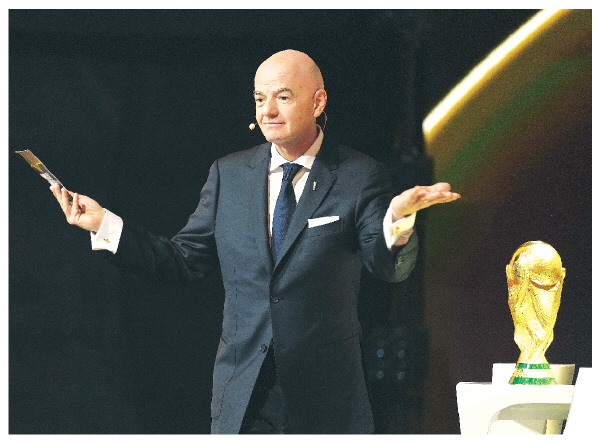 ↑12月5日,国际足联主席因凡蒂诺在抽签仪式现场。
