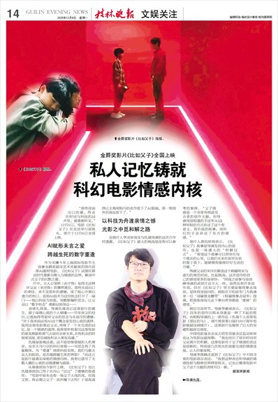 总制片人李灵妍谈及与仇晟导演的这次合作时透露,《比如父子》最大的挑战是没有可以参考的案例。“父子情感是一个非常传统甚至古老的创作主题,但导演用很轻盈的手法和AI这种年轻的方式讲述了这个有意义、有价值的故事,用科幻的手法讲述了东方的情感。”