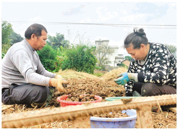 7日,在荔浦县杜莫镇,村民们正在田里挖马蹄。如今正值马蹄上市初期,村民们抢抓时节,挥锄采挖、分拣装袋……田间地头一片忙碌的景象。