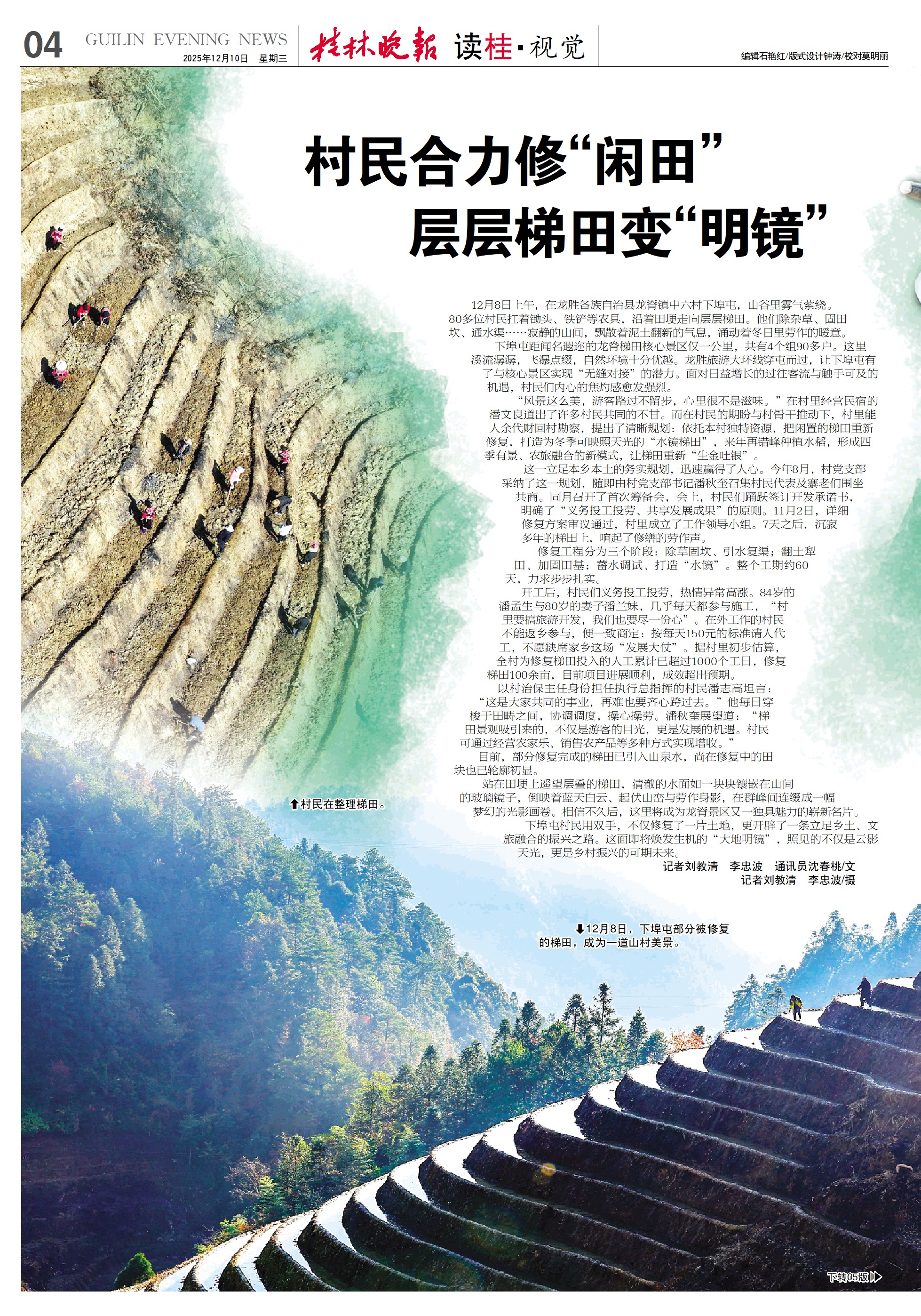 12月8日上午,在龙胜各族自治县龙脊镇中六村下埠屯,山谷里雾气萦绕。80多位村民扛着锄头、铁铲等农具,沿着田埂走向层层梯田。他们除杂草、固田坎、通水渠……寂静的山间,飘散着泥土翻新的气息,涌动着冬日里劳作的暖意。