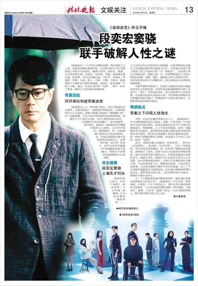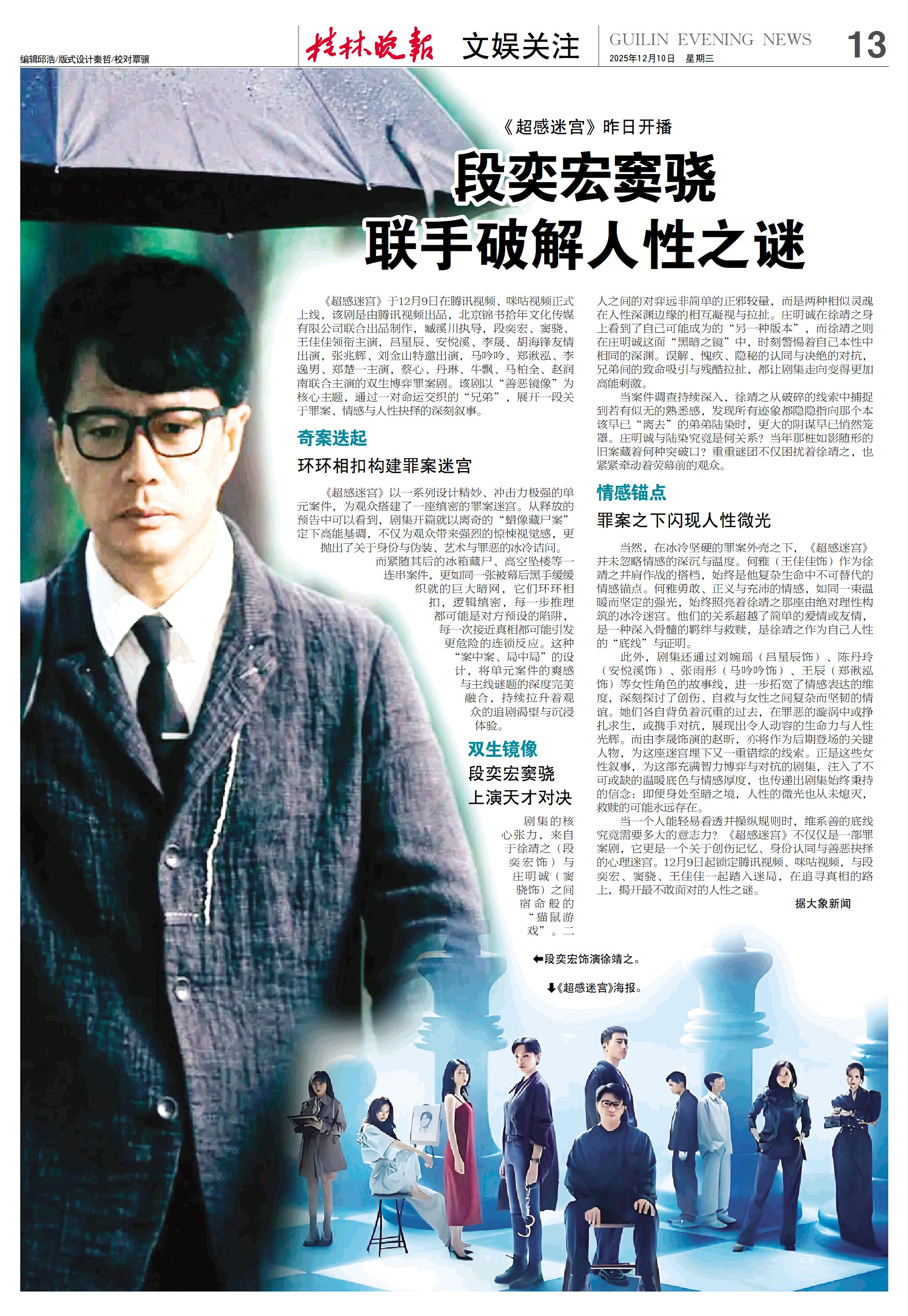 《超感迷宫》于12月9日在腾讯视频、咪咕视频正式上线,该剧是由腾讯视频出品,北京锦书拾年文化传媒有限公司联合出品制作,臧溪川执导,段奕宏、窦骁、王佳佳领衔主演,吕星辰、安悦溪、李晟、胡海锋友情出演,张兆辉、刘金山特邀出演,马吟吟、郑湫泓、李逸男、郑楚一主演,蔡心、丹琳、牛飘、马柏全、赵润南联合主演的双生博弈罪案剧。该剧以“善恶镜像”为核心主题,通过一对命运交织的“兄弟”,展开一段关于罪案、情感与人性抉择的深刻叙事。