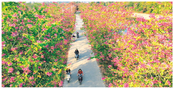 日前,雁山区柘木镇窑头段漓江边,道路两侧种植的红花羊蹄甲花开正艳。不少市民来到树下,打卡拍照,将这美好的瞬间定格,享受花儿带来的芬芳与视觉盛宴。