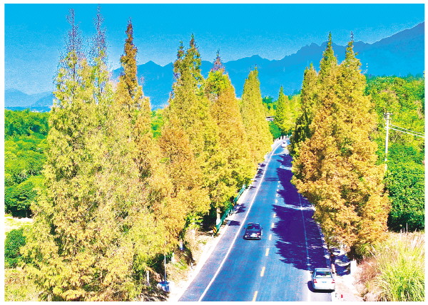 连日来,天气晴好。冬日暖阳下,321国道(桂林临桂区五通至中庸段)仿佛一道流动的生态画廊。两侧的杉树尽披红黄霓裳,绚烂的色彩在澄澈的蓝天下交织晕染,如诗如画。 记者李凯 摄