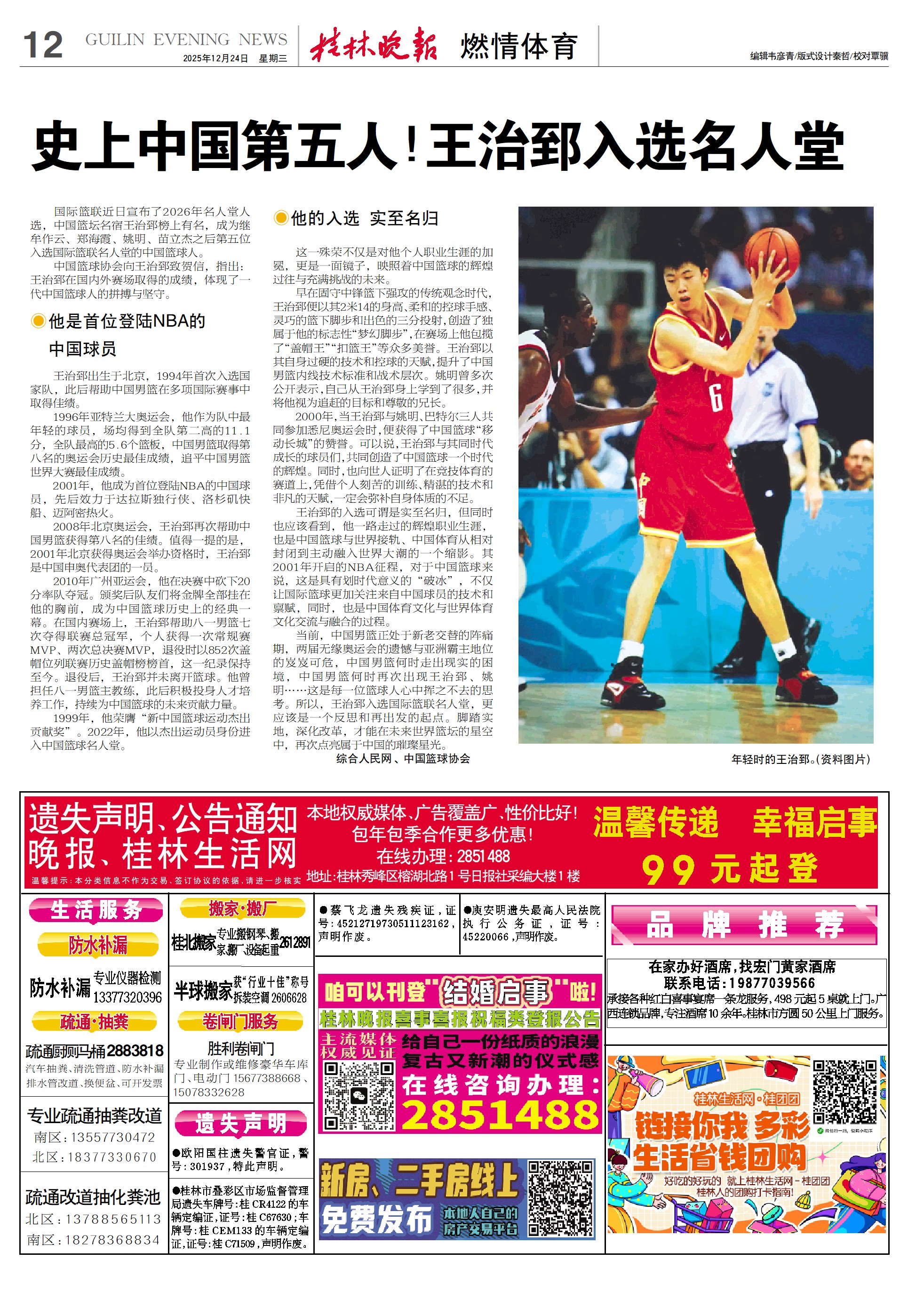 史上中国第五人!王治郅入选名人堂