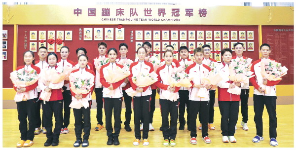 12月22日,中国蹦床队世界冠军在登榜仪式后合影。