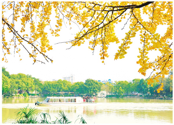 近日,两江四湖边的银杏树已经披上了“金色衣装”,近处的叶片、水面上的游船以及远处的桥共同构成了一幅和谐美丽的画。