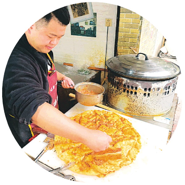 记者趁热尝了一口酱饼,咸甜交织的酱香在舌尖散开,外皮脆得掉渣,内里软而不黏,越嚼越香,一份4元的酱饼足够饱腹。