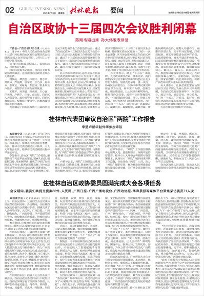 本报南宁讯(记者张婷婷)2月5日上午,自治区政协十三届四次会议完成各项议程后胜利闭幕。会议期间,住桂林自治区政协委员认真履行职责,圆满完成了大会各项任务。人民网、广西日报、广西广播电视台、广西政协报、华声晨报等媒体平台,纷纷聚焦采访报道,积极讲好桂林故事,传递桂林声音,展现桂林形象。