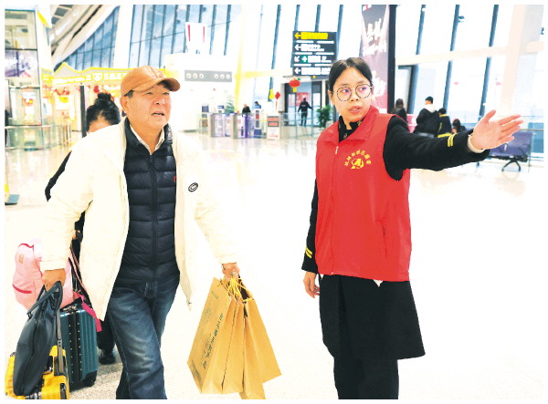 春运期间,在桂林两江国际机场人流密集的地方,人们都能看到身穿红马甲的志愿者,他们用一个手势、一个微笑,温暖着大家的春运回家路。图为一名志愿者在指引旅客。 记者李凯 摄