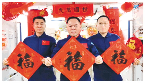 春节前夕,神舟二十一号航天员乘组在中国空间站向全国人民拜年(视频截图)。 新华社发