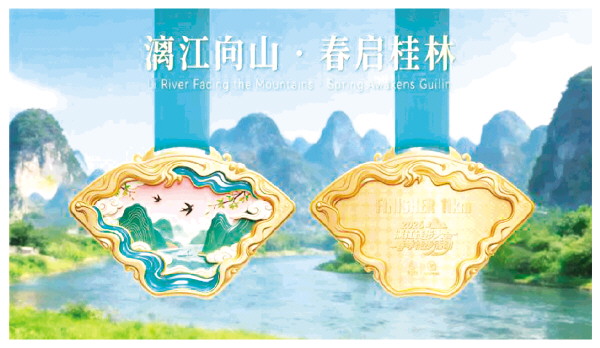 一座城的山水风光,在一枚奖牌里闪耀。此次发布的春季徒步奖牌整体造型打破常规,将桂林经典的喀斯特山峦轮廓化作奖牌外沿,以别致的扇形呈现。视觉主线上,一湾“漓江春水”缓缓流淌,远山、归燕、竹筏、渔翁等经典桂林元素点缀其间,将初春的生机与温润定格于方寸之间。