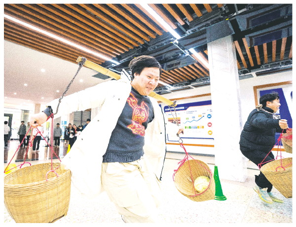 3月19日,学生在湖南农业大学参加农趣运动游戏——竞速搬运。