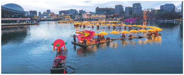 华灯初上时,北京亮马河两岸霓虹闪烁,伴着《山歌好比春江水》悠扬的旋律,一条240多米长的“金龙”缓缓游入河中,“金龙”蜿蜒游动、气势磅礴,瞬间点燃四周围观市民、游客的热情。