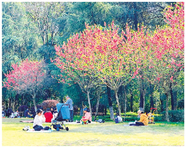 近日,在桂林园林植物园内,不少市民在草坪上休闲,感受春季万物复苏的气息,欣赏美好春光。 记者周子琪 摄