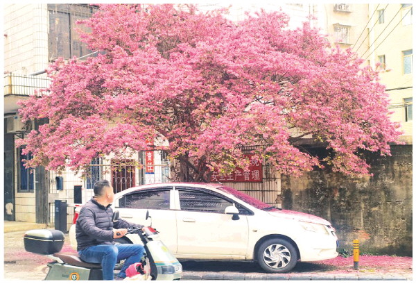 近日,清风小区一个不起眼的转角处,一株红檵木开得正盛,远看犹如一团奔放的火焰,绽放浓浓“春意”。 记者周子琪 摄