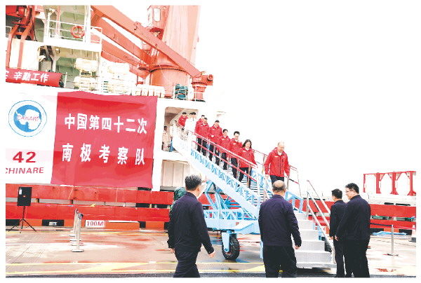 4月9日,中国第42次南极考察队队员走下“雪龙”号。
