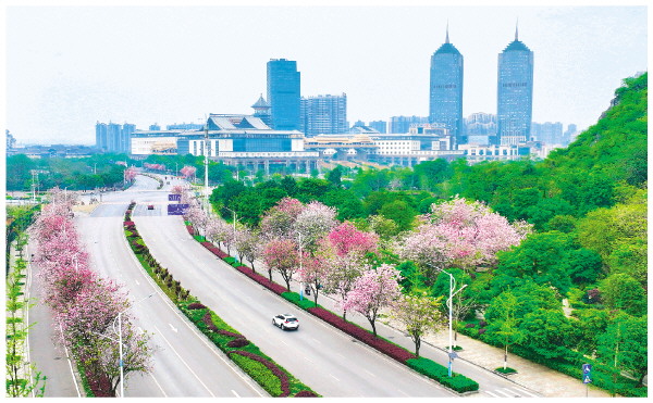近日,临桂区多条路段的紫荆花盛开,红色、粉色、白色的花朵缀满枝头,为城市披上浪漫的色彩。图为山水大道的紫荆花盛放,与周边的绿植相映成趣。