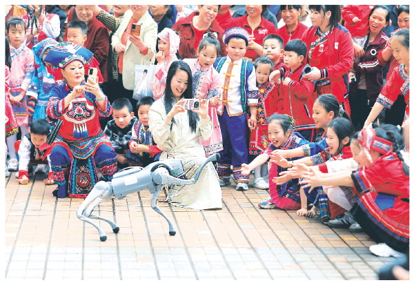 图为机器狗在活动现场与群众互动。